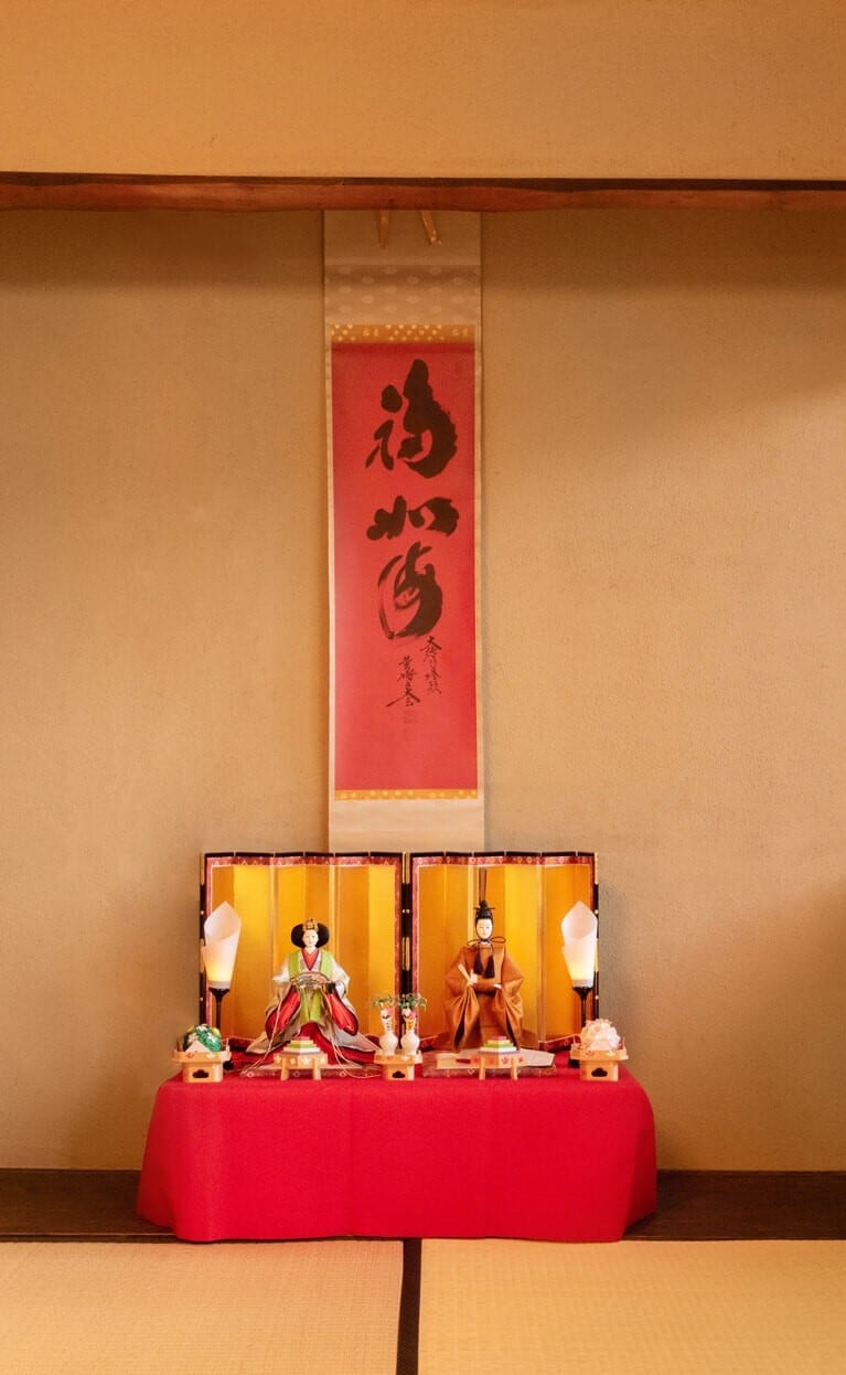 京十番親王飾り「源氏香」のご紹介です。 京都・西陣には多くの織物屋さんがあり今でも様々な帯や金襴を織られています。 今回の「源氏香」は、西陣・宗悦にてお願いし織っていただいた袋帯を衣装にしました。 さて「源氏香」。 「香道」の世界で5つのお香の匂いをかぎ、同じもの同士を横線でつなぎ合わせたものを図式化したもので「源氏香の図」というのが正式名称です。 全部で52通りになり「源氏物語」の54帖のうち二つを除いたものを表し、自分が思う答えに当てはまる物語中の「題名」を答えるという、すごく奥の深い遊びから生まれたもので江戸時代に流行したといわれています。 そんな意匠の帯を色違いで使い男雛と女雛の衣装にしました。 単純に2本の帯を使用することになりますが、こだわるが故の「贅沢」です。 飾りもシンプルに。 お屏風は京都・北村松月堂さまの本葬屏風に桜吹雪が描かれており、親王台もこだわり雰囲気に負けない畳をご用意しました。 こちらのお揃いにはお道具は一切用意せず、季節の「お花」と「雛菓子」などで賑わいを作ればさぞかし楽しいひな祭りになりそうですね。 こんなお雛さまは、いかがでしょうか。 さらに詳しくお聞きになりたい場合は、お問い合わせください。