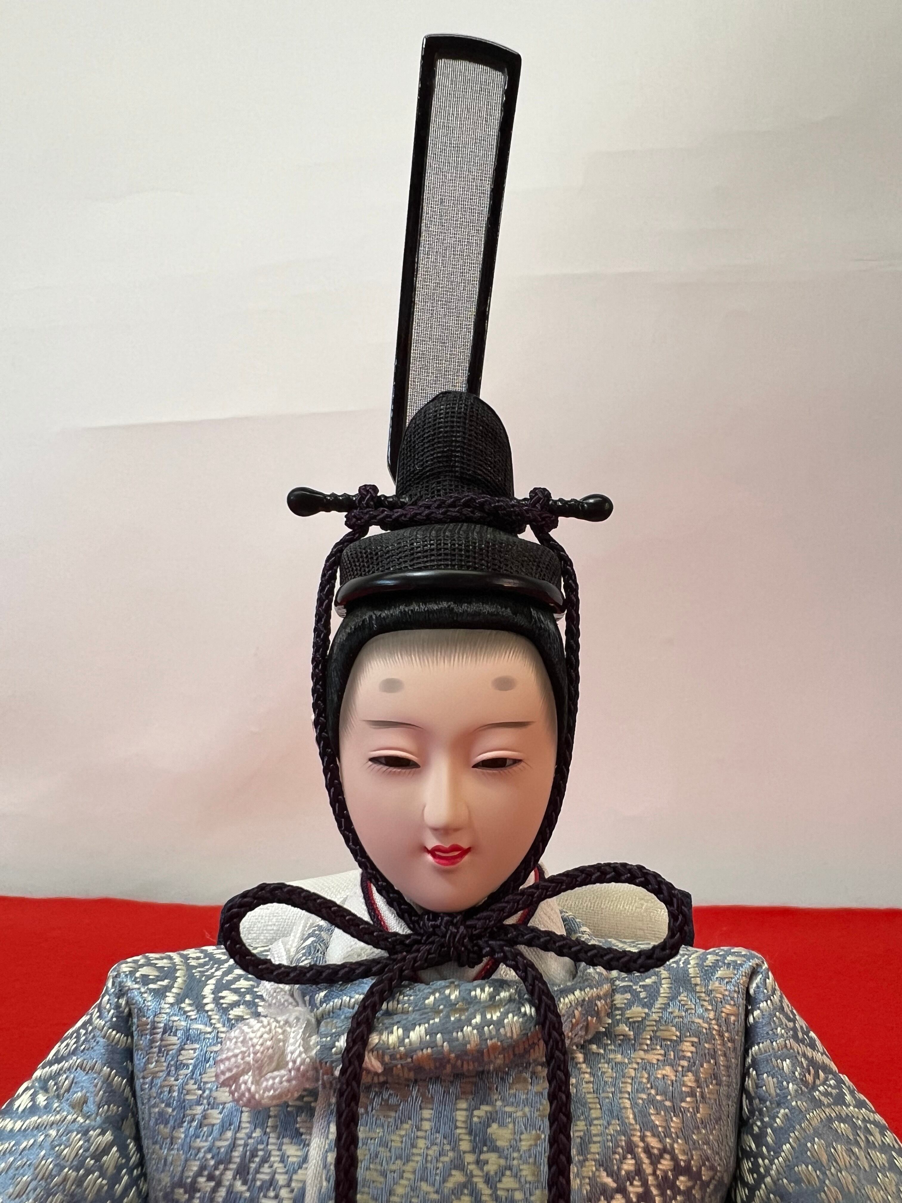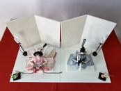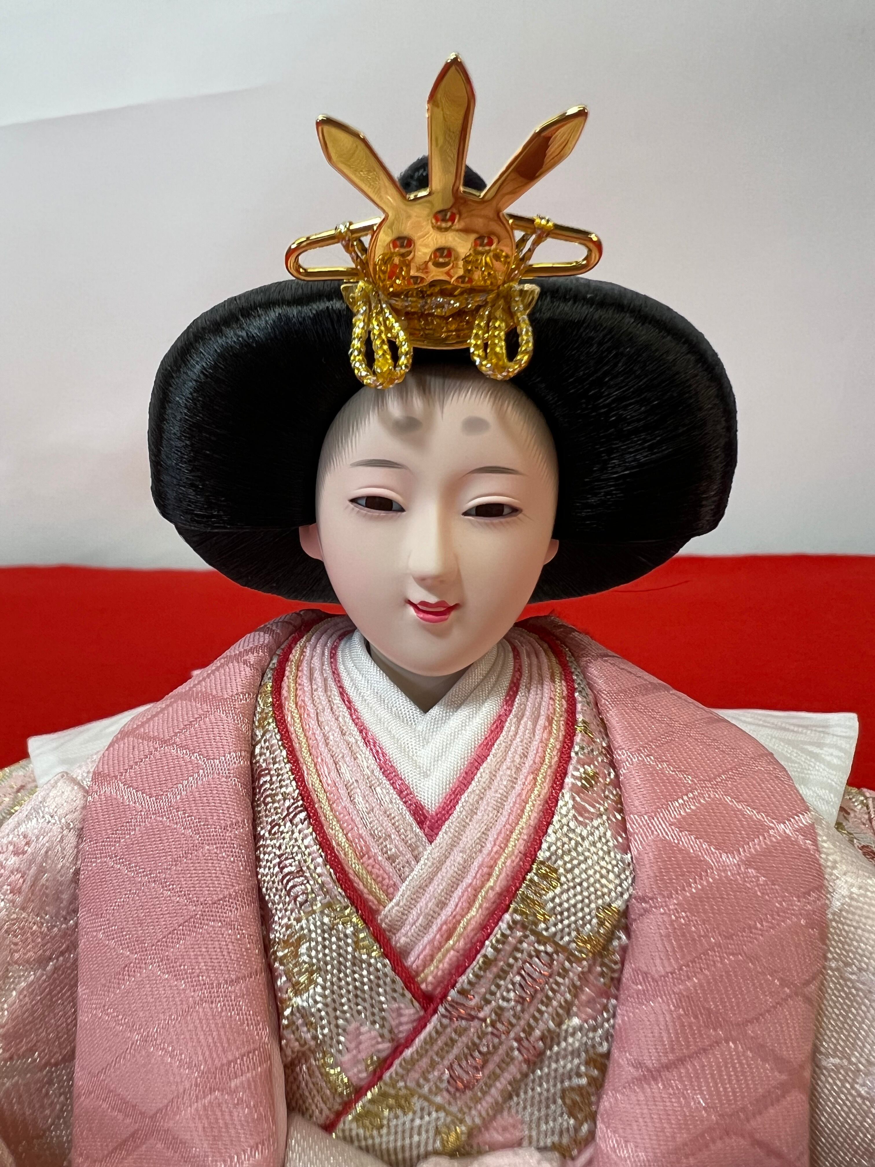 男雛には、「青空に舞う桜の花びら」そのままの正絹織物を使い、女びなには、桜のやさしさを表すピンクと水面の輝きをかさねに表現しました。